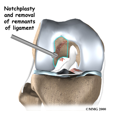 Next, the surgeon prepares the knee to place the graft. The remnants of the original ligament are removed. The intercondylar notch (mentioned earlier) is enlarged so that nothing will rub on the graft. This part of the surgery is referred to as a: