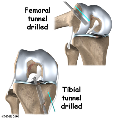 Once this is done, in the tibia and the femur to place the graft. These holes are placed so that the graft will run between the tibia and femur in the same direction as the original ACL.