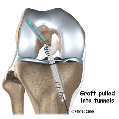 The graft is then through the drill holes. Screws or staples are used to hold the graft inside the drill holes.