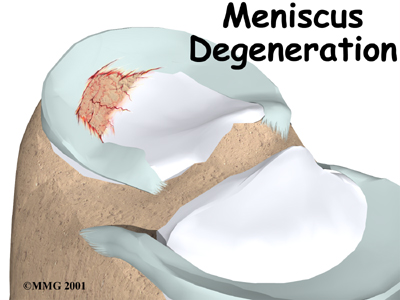 The tissue that forms the menisci weakens with age, making the menisci prone to . People of older ages often end up with a tear as result of a minor injury, such as from the up-and-down motion of squatting. Most often, there isn't one specific injury to the knee that leads to the degenerative type of meniscal tear. These tears of the menisci are commonly seen as a part of the overall condition of osteoarthritis of the knee in aging adults. Degenerative tears cause the menisci to fray and become torn in many directions.