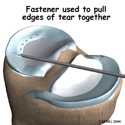 To repair the torn meniscus, the surgeon inserts the arthroscope and views the torn meniscus. Some surgeons use sutures to sew the torn edges of the meniscus together. Others use , called suture anchors, to anchor the torn edges together.
