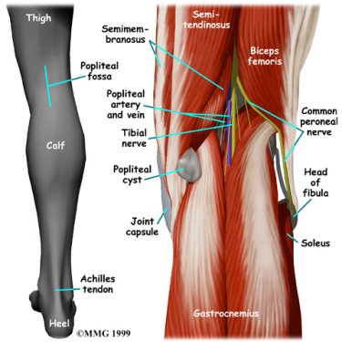 A popliteal cyst forms very near the of the leg. It is possible that these structures can be injured during surgery.