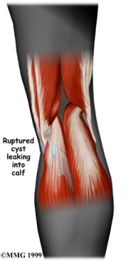 Sometimes a cyst will suddenly burst underneath the skin, causing pain and swelling in the calf. A gives symptoms just like those of a blood clot in the leg, called thrombophlebitis. For this reason, it is important to determine right away the cause of the pain and swelling in the calf. Once the cyst ruptures, the fluid inside the cyst simply leaks into the calf and is absorbed by the body. In this case, you will no longer be able to see or feel the cyst. However, the cyst will probably return in a short time.