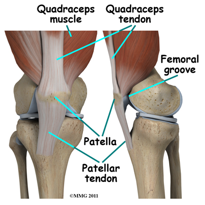 The knee joint is formed where the femur (lower end of the thighbone) connects with the tibia (upper end of the main lower leg bone). On the front of the joint is the patella (kneecap). The patella is what is called a sesamoid bone that is a part of the extensor mechanism of the knee joint. The extensor mechanism connects the large muscles of the thigh to the tibia such that contracting the thigh muscles pulls on the tibia and allows us to straighten the knee. The parts of the extensor mechanism include the thigh muscles, the quadriceps tendon, the patella and the patellar tendon.