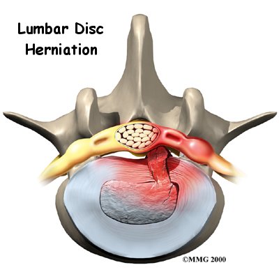 A lumbar disc can also become herniated during an acute (sudden) injury. Lifting with the trunk bent forward and twisted can cause a disc herniation. A disc can also herniate from a heavy impact on the spine, such as falling from a ladder and landing in a sitting position.