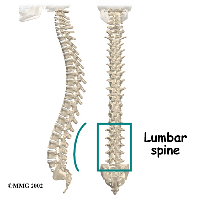 The lumbar spine is made up of the lower five vertebrae. Doctors often refer to these vertebrae as L1 to L5. These five vertebrae line up to give the low back a slight inward curve. The lowest vertebra of the lumbar spine, L5, connects to the top of the sacrum, a triangular bone at the base of the spine that fits between the two pelvic bones. Some people have an extra, or sixth, lumbar vertebra. This condition doesn't usually cause any particular problems.