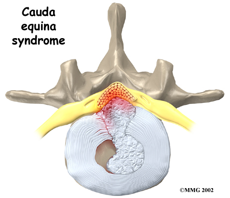 Rarely, symptoms involve changes in bowel and bladder function. A large disc herniation that pushes straight back into the spinal canal can put pressure on the nerves that go to the bowels and bladder. The pressure may cause low back pain, pain running down the back of both legs, and numbness or tingling between the legs in the area you would contact if you were seated on a saddle. The pressure on the nerves can cause a loss of control in the bowels or bladder. This is an emergency. If the pressure isn't relieved, it can lead to permanent paralysis of the bowels and bladder. This condition is called . Doctors recommend immediate surgery to remove pressure from the nerves.