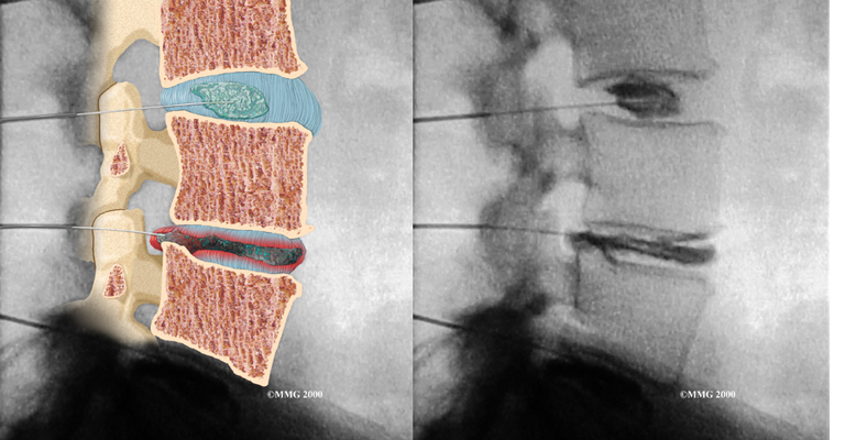 Doctors sometimes order a specialized X-ray test called . In this test, dye is injected into one or more discs. The dye is seen on X-ray and can give some information about the health of one or more discs. This test may be used when surgery is being considered to determine which disc is causing problems.
