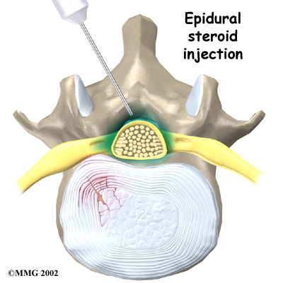 Some patients who continue to have symptoms are given an (ESI). Steroids are powerful anti-inflammatories. In an ESI, medication is injected into the space around the lumbar spinal nerves where they branch off of the spinal cord. This area is called the epidural space. Some doctors inject only a steroid. Most doctors, however, combine a steroid with a long-lasting numbing medication. Generally, an ESI is given only when other treatments aren't working. But ESIs are not always successful in relieving pain. If they do work, they often provide only temporary relief.