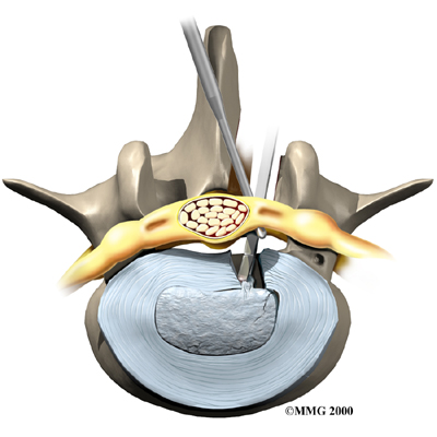 The lamina forms a roof-like structure over the back of the spinal canal. In this procedure, a thumbnail-sized piece of the lamina is removed (laminotomy) so the surgeon can more easily take out the problem disc (discectomy). This procedure is mainly used when the herniated disc is putting pressure on a nerve and causing pain to spread down one leg.