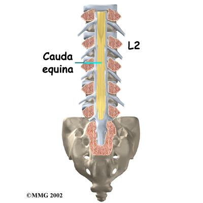 The spinal cord only extends to the second lumbar (low back) vertebra. Below this level, the spinal canal encloses a bundle of nerves that go to the lower limbs and pelvic organs. The Latin term for this bundle of nerves is , meaning horse's tail.