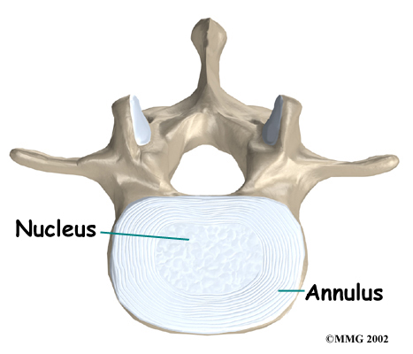 An intervertebral disc fits between each vertebral body and provides a space between the spine bones. The disc normally works like a shock absorber. It protects the spine against the daily pull of gravity. It also protects the spine during heavy activities that put strong force on the spine, such as jumping, running, and lifting.