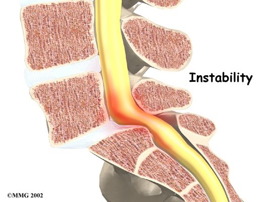 Spinal instability: can cause spinal stenosis. Spinal instability means that the bones of the spine move more than they should. Instability in the lumbar spine can develop if the supporting ligaments have been stretched or torn from a severe back injury. People with diseases that loosen their connective tissues may also have spinal instability. Whatever the cause, extra movement in the bones of the spine can lead to spinal stenosis.