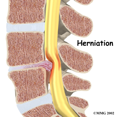 Disc herniation: Spinal stenosis can occur when an intervertebral disc in the low back (ruptures). Normally, the shock-absorbing disc is able to handle the downward pressure of gravity and the strain from daily activities. However, if the pressure on the disc is too strong, such as landing from a fall in a sitting position, the nucleus inside the disc may rupture through the outer annulus and squeeze out of the disc. This is called a disc herniation. If an intervertebral disc herniates straight backward, it can press against the nerves in the spinal canal, causing symptoms of spinal stenosis.