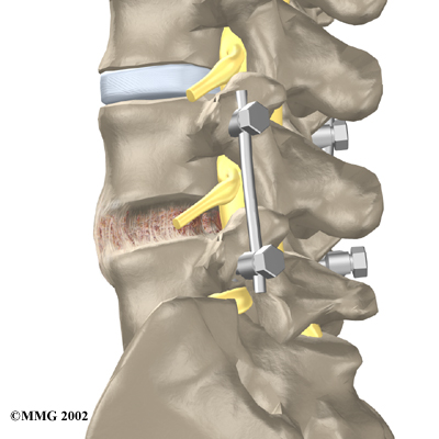 A fusion surgery joins two or more bones into one solid bone. This keeps the bones and joints from moving. In this procedure, the surgeon lays small grafts of bone over the back of the spine. Most surgeons also apply metal plates and screws to prevent the two vertebrae from moving. This protects the graft so it can heal better and faster.