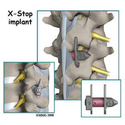 If the symptoms you feel are mild and there is no danger they'll get worse, surgery is not usually recommended. Some patients may benefit from the use of a device called the X-STOP. The X-STOP is a metal implant made of titanium. The implant is inserted through a small incision in the skin of your back. It is designed to fit between the spinous processes of the vertebrae in your lower back. It stays in place permanently without attaching to the bone or ligaments in your back.