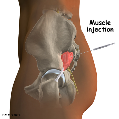 Botulism injection therapy (also known as Botox injections) can be used to actually paralyze the piriformis muscle. This makes the muscle relax, which helps take pressure off the sciatic nerve. The effect of the Botox injection isn't permanent; it generally only lasts a few months. In the meantime, however, it is hoped that a stretching program can be used to fix the problem. In other words, when the injection wears off, the muscle may have been stretched enough so that the symptoms do not return.