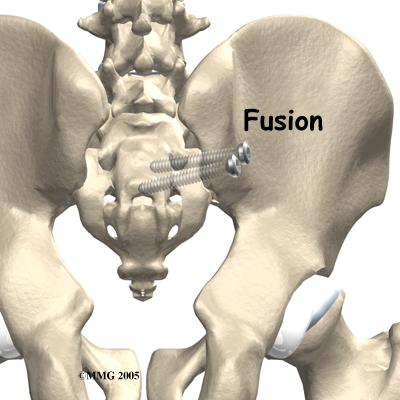 Surgery may be considered if other treatments don't work. Surgery consists of fusing the painful SI joint. A fusion is an operation where the articular cartilage is removed from both ends of the bones forming the joint. The two bones are held together with plates and screws until the two bones grow together, or fuse, into one bone. This fusion stops any motion between the two bones and theoretically eliminates the pain from the joint.