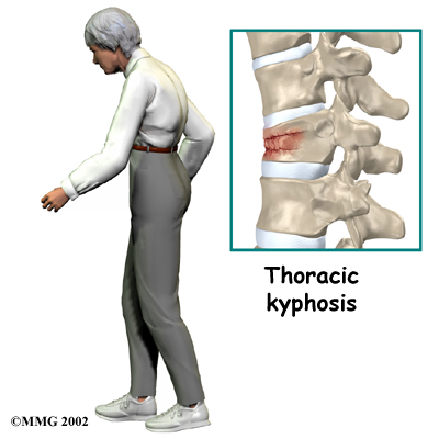 is a disease that weakens bone. Sometimes the bones in the spine weaken to the point that even mild forces can lead to a compression fracture. A simple action like reaching down to pull on a pair of socks can cause a weakened vertebra to fracture. The front of the vertebra (the part closest to the front of the body) crumbles, causing the round vertebral body to become wedge-shaped. This angles the spine forward, producing a hunch-backed appearance, called kyphosis.