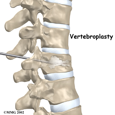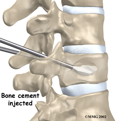 To perform vertebroplasty, the surgeon uses a fluoroscope to guide a needle into the fractured vertebral body. A fluoroscope is a special X-ray television that allows the surgeon to see your spine and the needle as it moves. Once the surgeon is sure the needle is in the right place, bone cement, called polymethylmethacrylate (PMMA), is injected through the needle into the fractured vertebra. A reaction in the cement causes it to harden within 15 minutes. This fixes the bone so that it does not collapse any further as it heals. More than 80 percent of patients get immediate pain relief with this procedure.