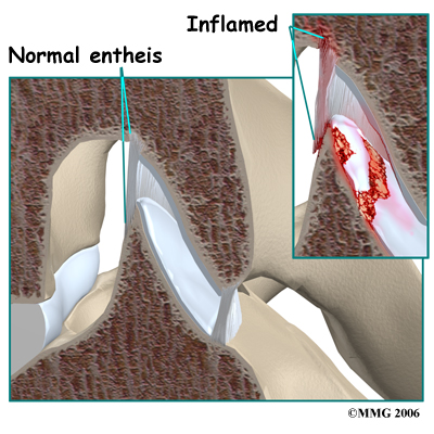 In some rheumatological diseases, the inflammatory process affects other areas of connective tissue such as where ligaments and tendons attach to the bone. This area is called an enthesis. There are entheses located all over the body with many in the spine itself, such as where the intervertebral disc attaches to the vertebra. Many of the rheumatological diseases that affect the spine seem to attack these particular areas of the spine but it is unclear why this occurs.