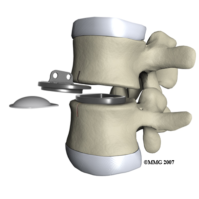 A plastic (polyethylene) core fits in between the two metal endplates. The core acts as a spacer and is shaped so that the endplates pivot in a way that imitates normal motion of the two vertebrae. There are small prongs or teeth on one side of each endplate. The teeth help anchor the endplate to the surface of the vertebral body.