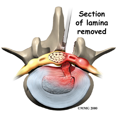 Laminotomy and discectomy is the traditional method of removing the disc. Laminotomy is taking off part of the lamina bone (the back of the ring over the spinal canal). This allows greater room for the surgeon to take out part of the disc (discectomy).