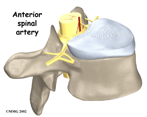Blood vessels that run up and down the spine nourish the spinal cord. However, only one vessel, the , goes to the front of the spinal cord in the area between T4 and T9. Doctors call this section of the spine the critical zone. If this single vessel is damaged, as can happen with pressure from a herniated thoracic disc, the spinal cord has no other way to get blood. Left untreated, this section of the spinal cord dies, which can lead to severe problems of weakness or paralysis below the waist.