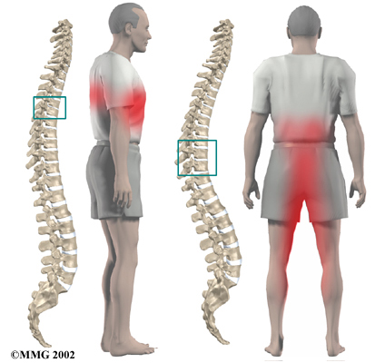 Disc herniations can affect areas away from the spine. Herniations in the upper part of the thoracic spine can radiate pain and other sensations into one or both arms. If the herniation occurs in the middle of the thoracic spine, pain can radiate to the abdominal or chest area, mimicking heart problems. A lower thoracic disc herniation can cause pain in the groin or lower limbs and can mimic kidney pain.