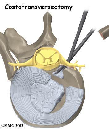Surgeons use to open a window through the bones that cover the injured disc. Operating from the back of the spine, the surgeon takes out a small section on the end of two or more ribs where they connect to the spine. (Costo means rib.) Then the bony knob on the side of the vertebra (the transverse process) is removed. (Ectomy means to remove.) This opens a space for the surgeon to work. The injured portion of the disc that is pressing against the spinal cord is removed (discectomy) with small instruments. Surgeons take extreme care not to harm the spinal cord.