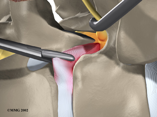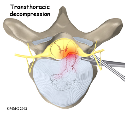 With the patient on his or her side, the surgeon cuts a small opening through the ribs on the side of the thorax (the chest). Instruments are placed through the opening, and the herniated part of the disc is taken out. This takes pressure off the spinal cord (decompression).