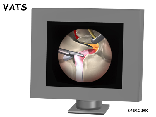 Recent developments in thoracic surgery include video assisted thoracoscopy surgery (VATS). This procedure is done with a thoracoscope, a tiny television camera that can be inserted into the side of the thorax through a small incision. The camera allows the surgeon to see the area where he or she is working on a . Small incisions give passage for other instruments used during the surgery. The surgeon watches the TV screen while damaged portions of the disc.