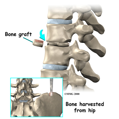 In this procedure, the surgeon lays small grafts of bone over or between the loose spinal bones. Surgeons may use a combination of screws, cables, and rods to prevent the vertebrae from moving and allow the graft to heal.