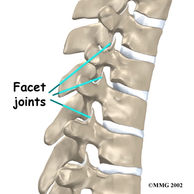 Between the vertebrae of each spinal segment are two facet joints. are located on the back of the spinal column. There are two facet joints between each pair of vertebrae, one on each side of the spine. A facet joint is made of small, bony knobs that line up along the back of the spine. Where these knobs meet, they form a joint that connects the two vertebrae. The alignment of the facet joints of the thoracic spine allows freedom of movement as you twist back and forth or lean side to side.