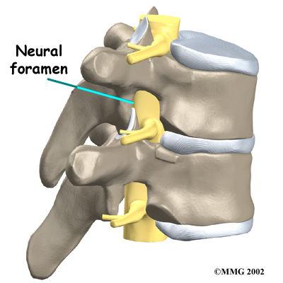 On the left and right side of each vertebra is a small tunnel called a . (Foramina is the plural term.) The two nerves that leave the spine at each vertebra go through the foramina, one on the left and one on the right. The intervertebral disc (described later) sits directly in front of the opening. A bulged or herniated disc can narrow the opening and put pressure on the nerve. A facet joint sits in back of the foramen. Bone spurs that form on the facet joint can project into the tunnel, narrowing the hole and pinching the nerve.