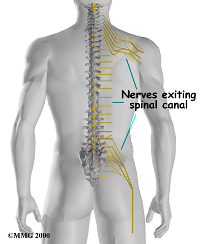 Between the vertebrae, two large branch off the spinal cord, one on the left and one on the right. The nerves pass through the neural foramina of each vertebra. These spinal nerves group together to form the main nerves that go to the organs and limbs. The nerves of the thoracic spine mainly control the muscles and organs of the chest and abdomen.