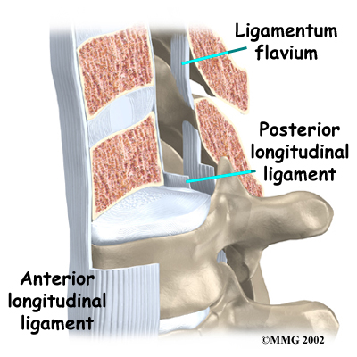Connective tissues are networks of fiber that hold the cells of the body together. Ligaments are strong connective tissues that attach bones to other bones. Several long ligaments connect on the front and back sections of the vertebrae. The anterior longitudinal ligament runs lengthwise down the front of the vertebral bodies. Two other ligaments run full length within the spinal canal. The posterior longitudinal ligament attaches on the back of the vertebral bodies. The ligamentum flavum is a long elastic band that connects to the front surface of the lamina bones. Thick ligaments also connect the ribs to the transverse processes of the thoracic spine.