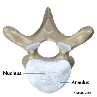 An intervertebral disc is made of . The center, called the nucleus, is spongy. It provides most of the shock absorption in the spine. The nucleus is held in place by the annulus, a series of strong ligament rings surrounding it.