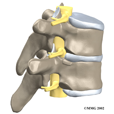 Each spinal segment includes two vertebrae separated by an intervertebral disc, the nerves that leave the spinal column at each vertebra, and the small facet joints that link each level of the spinal column.