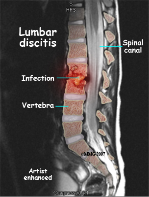 Discitis and vertebral osteomyelitis are rare in children. When a disc becomes inflamed and possibly infected, the condition is called discitis. If the vertebral bone becomes infected, the condition is called vertebral osteomyelitis.