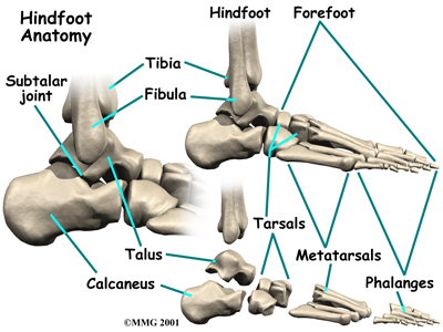The tarsal bones are the seven bones that make up the heel and the midfoot. The metatarsals and the phalanges are connected to the tarsals and form the forefoot. Clubfoot primarily affects three bones: the calcaneus, talus and navicular. The deformity can affect the growth of the entire foot to some degree so other bones may be involved as well.
