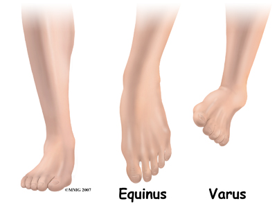 The clubfoot is unmistakable. The foot is turned under and towards the other foot. The medical terminology for this position is equinus and varus. Equinus means that the toes are pointed down and the ankle flexed forward (sort of like the position of the foot when a ballet dancer is on her toes). Varus means tilted inward. The ankle is in varus position when you try to put the soles of your feet together.