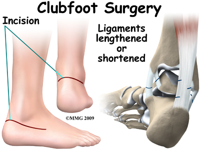 The surgical procedure to correct clubfoot is tedious and complex, but the goals are always the same. Your surgeon will find and cut all the ligaments that are too tight. When they are cut, they eventually heal back with scar tissue. In the growing infant, this scar tissue will grow back to form new ligaments that are not so tight.