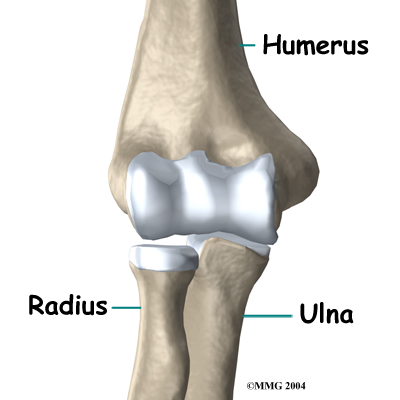 The bones of the elbow are the humerus (the upper arm bone), the ulna (the larger bone of the forearm, on the opposite side of the thumb), and the radius (the smaller bone of the forearm on the same side as the thumb).