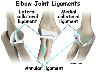 In the elbow, two of the most important ligaments are the medial collateral ligament and the lateral collateral ligament. The medial collateral is on the inside edge of the elbow, and the lateral collateral is on the outside edge. Together these two ligaments connect the humerus to the ulna and keep it tightly in place as it slides through the groove at the end of the humerus. These ligaments are the main source of stability for the elbow. They can be torn when there is a severe injury or dislocation of the elbow. These ligaments are not generally injured in the condition referred to as nursemaid's elbow.