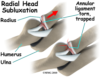 In young children, the annular ligament of the radial head is thin and weak. A sudden pull on the forearm can tear this soft tissue structure. The radial head is pulled down through the tear. The annular ligament slips into the radiohumeral joint and becomes trapped between the two joint surfaces when the arm is let go. This is a radial head subluxation. When the annular ligament is pinched it causes pain.
