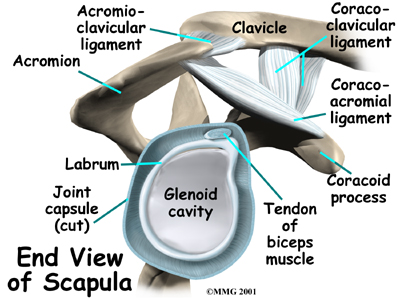 A special type of ligament forms a unique structure inside the shoulder called the labrum. The labrum is attached almost completely around the edge of the glenoid. When viewed in cross section, the labrum is wedge-shaped. The shape and the way the labrum is attached create a deeper cup for the glenoid socket. This is important because the glenoid socket is so flat and shallow that the ball of the humerus does not fit tightly. The labrum creates a deeper cup for the ball of the humerus to fit into.