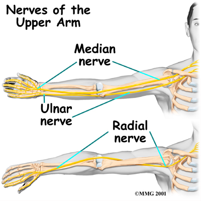 All of the that travel down the arm pass through the axilla (the armpit) just under the shoulder joint. Three main nerves begin together at the shoulder: the radial nerve, the ulnar nerve, and the median nerve. These nerves carry the signals from the brain to the muscles that move the arm. The nerves also carry signals back to the brain about sensations such as touch, pain, and temperature.