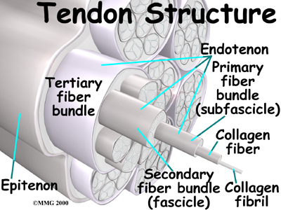 Tendons are made up of strands of a material called collagen. The collagen strands are lined up in bundles next to each other.