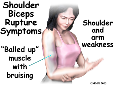 Patients often recall hearing and feeling a snap in the top of the shoulder. Immediate and sharp pain follow. The pain often subsides quickly with a complete rupture because tension is immediately taken off the pain sensors in the tendon. Soon afterward, bruising may develop in the middle of the upper arm and spread down to the elbow. The biceps may appear to have balled up, especially in younger patients who've had a traumatic biceps rupture. The arm may feel weak at first with attempts to bend the elbow or lift the shoulder.